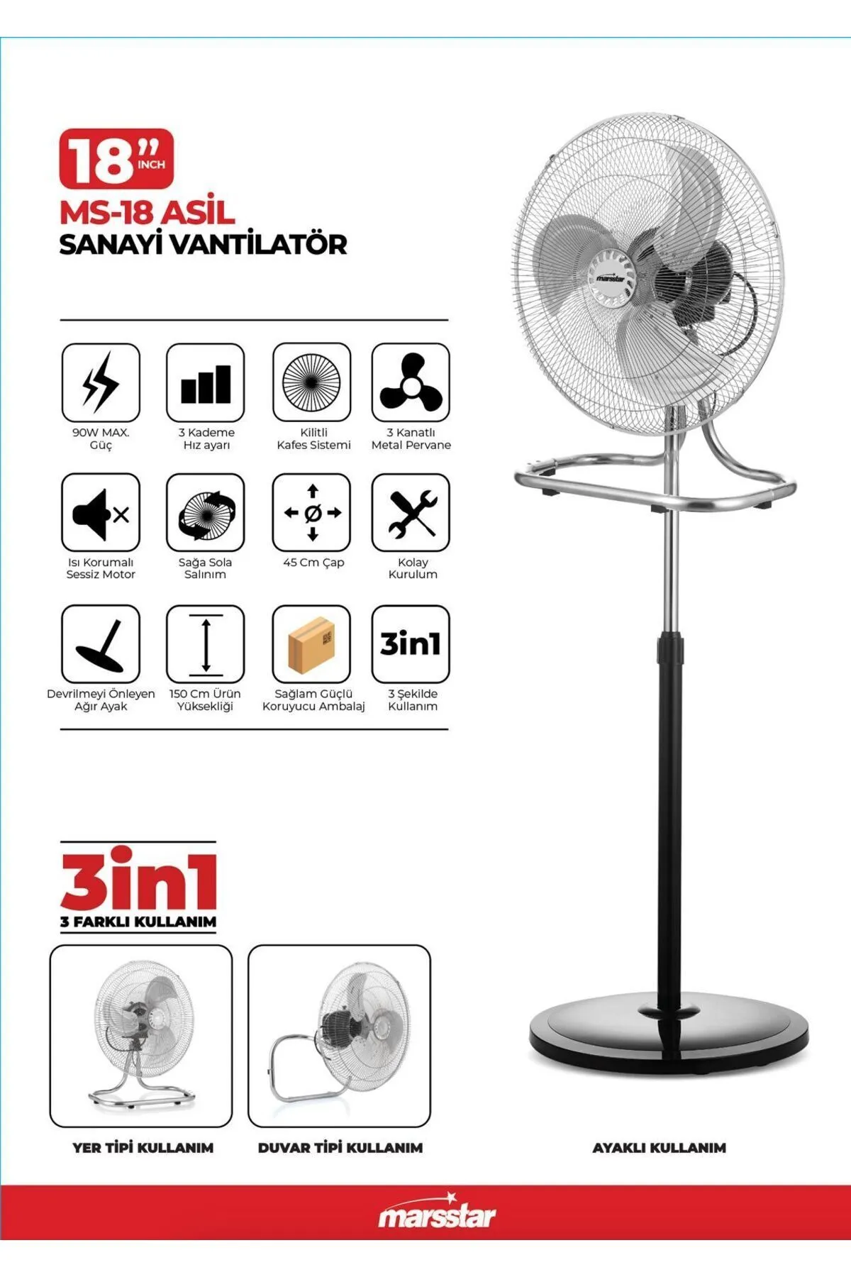 Marsstar MS-18 vantilatör; yüksek motor gücü, sağlam metal gövdesi ve 3 farklı kullanım modu (duvar tipi, masa tipi, ayaklı) ile hem ev hem iş yerlerinde üstün performans sunar.